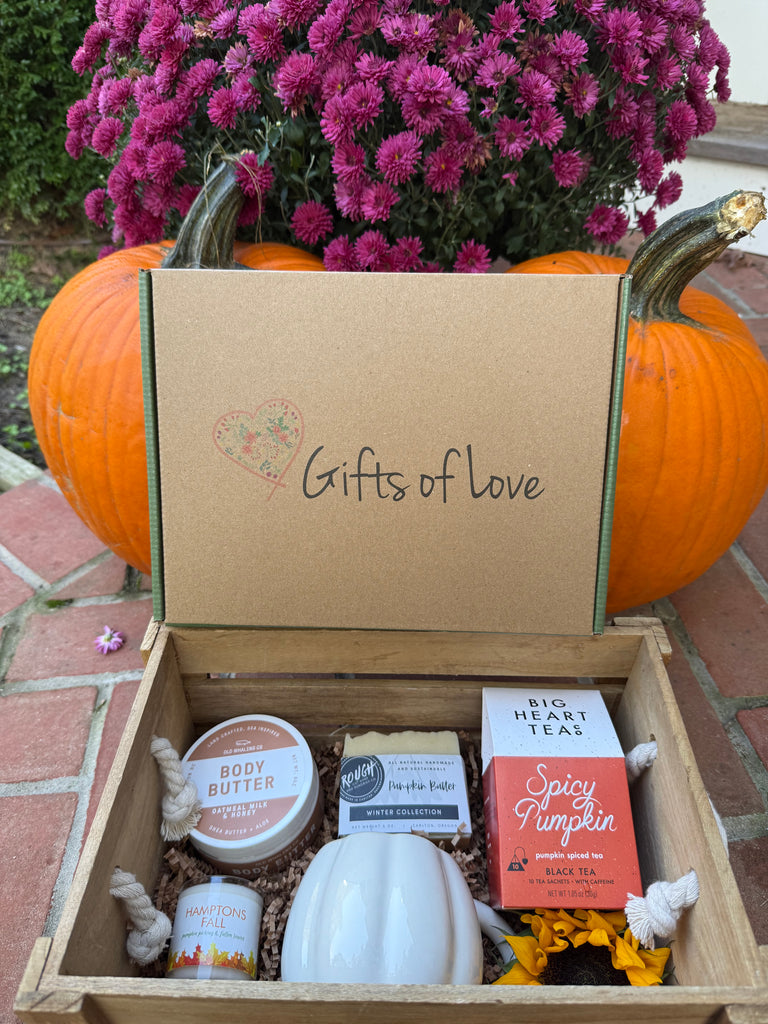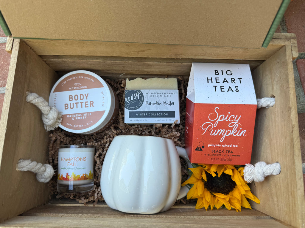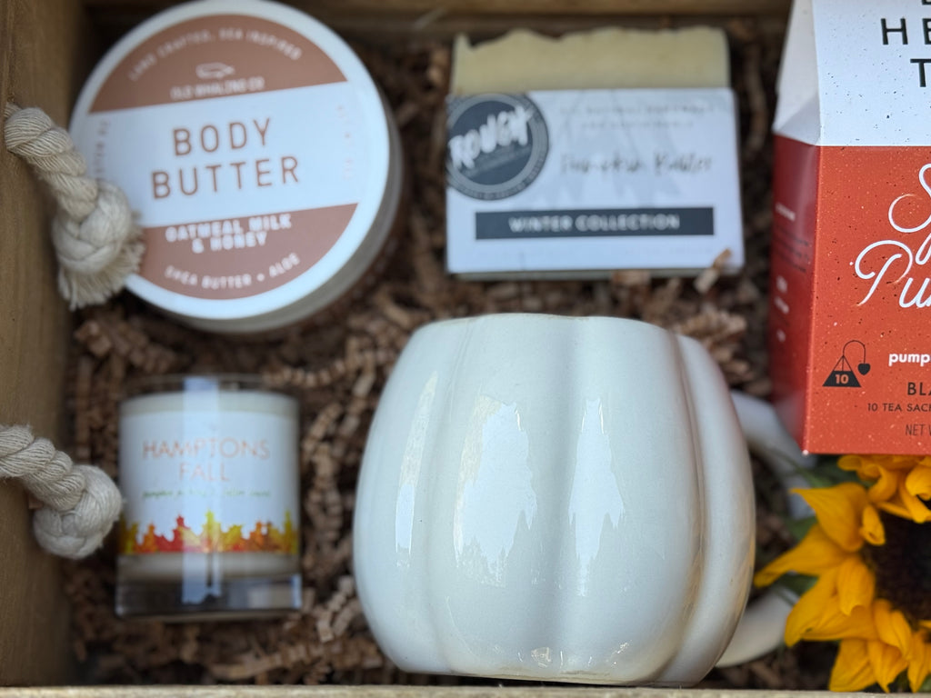 A box full of the Hamptons for Fall, featuring our exclusive Hamptons Fall candle🧡. Full of Pumpkin Butter and Oatmeal cream. A perfect Fall gift for any occasion. Don’t forget to add a note to make the gift super special!